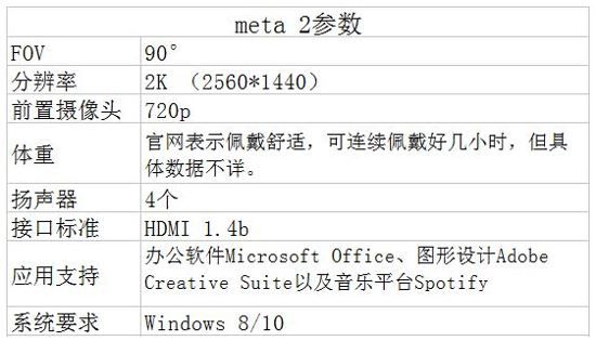 固然AR界老大哥微軟的HoloLens已經開始預售,但同為AR界的另一家美國初創公司Meta也提前發售了旗下的AR產品——Meta 2。 和HoloLens一樣,Meta 2是一款增強現實眼鏡,戴上它就能夠在你的真實視野里疊加虛擬影像。 參數方面,Meta 2擁有90度的半透明視野,比HoloLens的視場角要大,二代的投射屏幕分辨率為2560x1440,比擬一代有很大晉升。