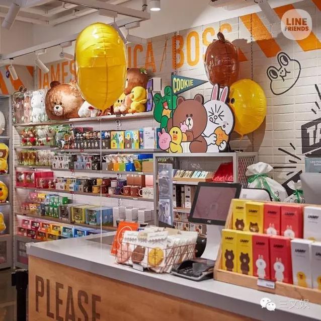 在2013年4月,Line還推出了另一部兒童向動畫《LINETOWN》,每集30分鐘,采用小戲院動畫的原班聲優。 除了動畫,圍繞Line品牌形象制作的漫畫也在2013年5月開始于《周刊少年SUNDAY》和《周刊YOUNGJUMP》上連載。 第五步,表情IP的商品和線下商店 除了線上和出版物,Line的表情卡通形象更加走進了各種實體商店,萌萌的可妮兔和布朗熊泛起在了各種文具、食物包裝上。 Line最早是在日本開設貼圖實體店,之后不斷擴充貼圖形象的衍出產品種類,并成功轉型開設Line friends這一主題商店,2013年到目前已在全球開設44家店面。 Line Friends Cafe&Store 既包括紀念品商店,也包括主題咖啡店,里面主要售賣一些Line貼圖形象的毛絨玩具、文具和餐具等周邊商品,并提供餐飲服務。它圍繞布朗熊和可妮兔兩個主要卡通形象進行主題營造,同時推出各種Line平臺上較熱點的貼圖形象周邊,并不斷與著名品牌合作聯名推出新產品,增強Line friends的品牌價值,實現更大的貼圖授權收益。 香港的Line Friends
