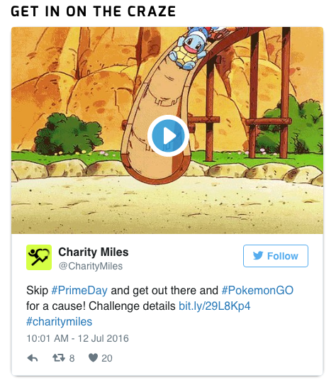 2. 別忘了,Pokémon GO還可以是今年最佳健身類(lèi)APP 假如你的公司正好深耕于人們的運(yùn)動(dòng)健康數(shù)據(jù)的挖掘或是像微公益一樣為公益捐步數(shù),那么Pokémon GO將為你提供極大的助益。要知道Pokémon GO的玩家都走得超級(jí)多,他們得到四處抓精靈,走2KM/5KM 的路,只是為了孵精靈蛋。難怪會(huì)有人說(shuō)這是今年最佳的健身類(lèi)APP,究竟國(guó)外為了抓小精靈天天走10公里當(dāng)即瘦下10公斤的勵(lì)志故事已經(jīng)發(fā)生。而Charity Miles就是一家專(zhuān)門(mén)人們的行走、步行或騎自行車(chē)的里程轉(zhuǎn)化為捐款的APP,