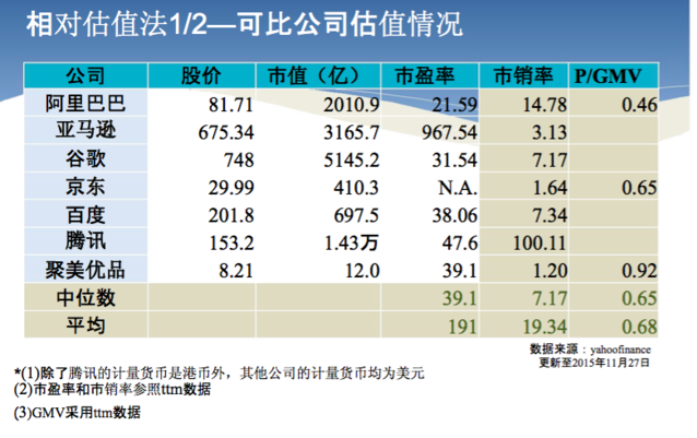 P/S估值:P/S指用市銷率(總市值/營收額),新美大(CIP)選取了阿里、亞馬遜、谷歌、京東、百度、騰訊、聚美優品這些上市公司,得出的P/S中位數為7.17,新美大(CIP)預計2016年、2017年、2018年其營收額分別是:132億元、287億元、560億元。以7x算,新美大(CIP)未來三年(2016-2018年)對應的市值(估值)分別是145億美元、317億美元、618億美元。 P/GMV估值:P/GMV是總市值/銷售額,新美大(CIP)為平臺模式,按銷售額提取傭金算作營收,阿里、京東、聚美優品的P/GMV分別為0.4、0.6、0.9,新美大(CIP)預計在2016年、2017年、2018年的GMV分別是:3983億元、7498億元、12747億元,按照0.65x算,未來三年(2016-2018年)的市值(估值)分別為408億美元、768億美元、1305億美元。