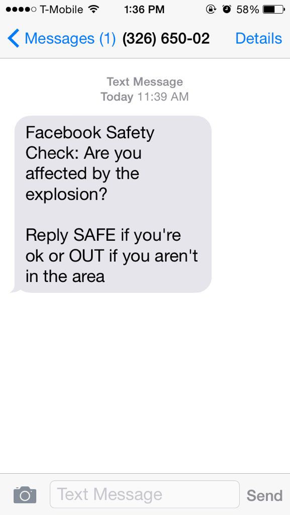 (圖片來源:推特) 可是當(dāng)戴爾先生慌忙望向窗外,卻只見天空晴朗,街道上行人自若,哪有半點失事了的痕跡?類似的短信也發(fā)到了印度等國家Facebook用戶的手機上,用戶之間廣泛傳播,一時間人心惶惶。 事實上,這是在當(dāng)天巴基斯坦發(fā)生爆炸事件后,F(xiàn)acebook啟用平安信使功能,將通知發(fā)送給受到波及的地區(qū)用戶,讓他們在Facebook上向親朋摯友報個平安。但由于程序錯誤,這則信息被發(fā)送到了遠在美國、歐洲、東亞的用戶,不明真相的用戶接到提醒后,造成了小規(guī)模的恐慌。 烏龍事件在推特等社交網(wǎng)絡(luò)上引發(fā)燒議,有用戶批評Facebook是在添亂。Facebook官方也在晚些時候發(fā)出報歉。