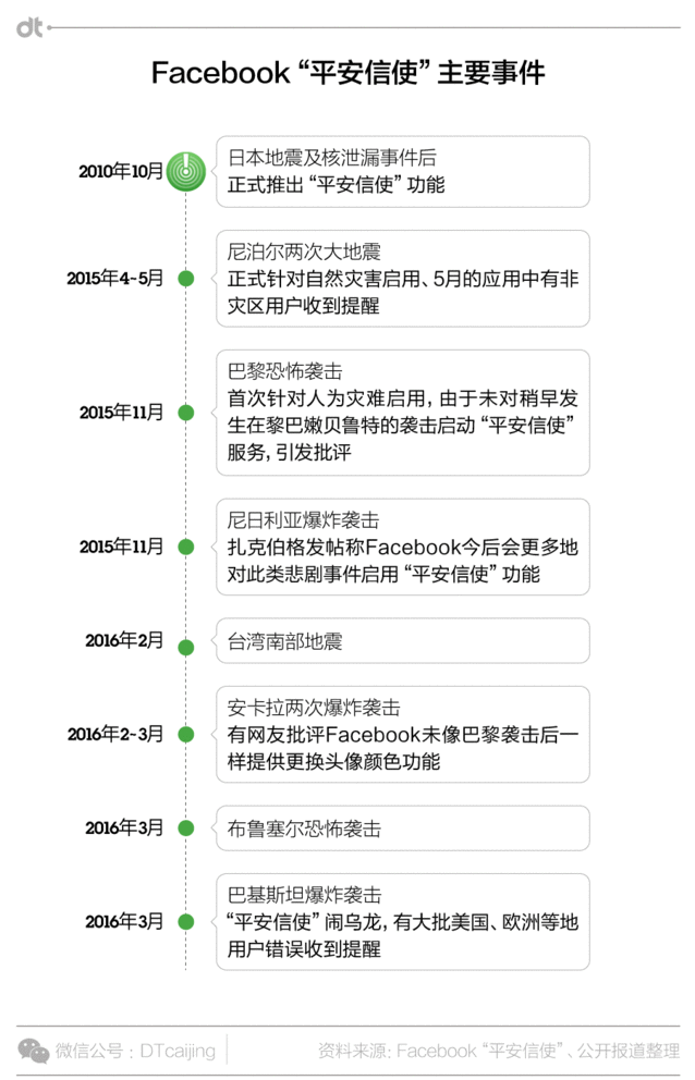(圖片來源:Facebook平安信使頁面) “平安信使”已經(jīng)推出了若干次盡管“平安信使”從推出到現(xiàn)在發(fā)生了一些烏龍,還由于這個功能涉及到定位追蹤和個人隱私的保護,也引發(fā)多次爭議。 不外這項服務(wù)的推出仍舊受到了良多歡迎,并且為實際救援提供了作用。 Facebook是第一個在大型災(zāi)害事故上系統(tǒng)推出報平安服務(wù)的社交媒體。災(zāi)害事件發(fā)生的時候,通信常常不暢,受影響地區(qū)的用戶會接收到大量的和災(zāi)害相關(guān)的信息以及親朋摯友的關(guān)心,傳統(tǒng)的通信方式效率低下,而龐大的社交網(wǎng)絡(luò)則是提供這一公共服務(wù)的最佳平臺。同時,你也可以看到自己摯友的報平安狀態(tài),以確定他們所處的情況。 這一功能最初是受日本地震及核泄漏事件啟發(fā),起初只是針對天然劫難。而去年巴黎恐怖襲擊后,F(xiàn)acebook首次針對人為災(zāi)害啟用平安信使,據(jù)Facebook自己公然的數(shù)據(jù),410萬用戶在巴黎襲擊后24小時內(nèi)匯報了平安,占了巴黎總?cè)丝诘慕种。這些報平安的帖子經(jīng)由大量傳播,終極看過報平安狀態(tài)的用戶數(shù)達到3.6億之多。