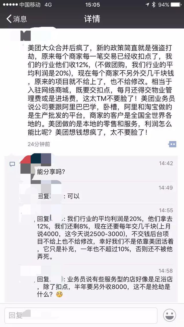 團長君不由迷惑。這豈非是新美大各項業(yè)務整合尚未完全結(jié)束,就開始從店家嘴里爭食? 回望去年互聯(lián)網(wǎng)領域,合并案風氣云涌,但是合并之后,整合之中發(fā)生什么題目,對市場產(chǎn)生了什么樣的實際效應,外界卻鮮有分析。從近期美團點評合并之后產(chǎn)生出來的種種效應,我們嘗試著從一個并購案例,看出互聯(lián)網(wǎng)合并對市場產(chǎn)生的各種端倪。 我們先來看看這件“美甲店被強收費”是怎么回事,為了更加客觀地了解事情緣由,首席觀察團獨家采訪了這位美甲店老板。 在當事人的要求下,我們暫且以G先生稱呼他。G先生家的美甲店開在三線城市,每年均勻到店消費的客戶分為老顧客和被美團團購業(yè)務吸引來的客戶。“我們店開了快十六年,與美團合作是去年一家新店開張時才合作的。實際上,美團帶來的客戶都是很便宜的客戶,成為會員的很少,最優(yōu)質(zhì)和不亂的客戶都不是美團帶來的。美團的客戶主要是圖便宜,客質(zhì)事實上是很差的。與美團合作,我們主要是為了鋪客量。” G先生表示,整個美甲行業(yè)的均勻利潤率是20%,百分之八十的同行在這兩年利潤下降都極其嚴峻,美團的新政策無疑讓本來利潤淡薄的美甲行業(yè)更加雪上加霜。“兩家合并后,收12%的抽成,這本身就不公道。” G先生頗無奈地說,“大約十天左右前,新美大溘然來了撥新的業(yè)務員,跟我講要抽取每年4000元的用度。這幾天又來催我,交2000元。假如不交,店面在網(wǎng)站上的信息就不予更改調(diào)整。”G先生表示,這太令人生氣了。“十幾二十塊錢的團購生意,還被剝這么多層皮,我們整個行業(yè)還要不要活了?!” 截止到團長君聯(lián)系G先生,他表示可能因為朋友圈施展的影響力,新美大的人打電話過來了解了情況,并把網(wǎng)站上拖了半個月不給修改的店面信息修改了。但用度仍是照收不誤。 實際上,涉及新美大壟斷的相關事件一直被多行業(yè)職員爆料吐槽。 今年1月,武漢爆發(fā)KTV行業(yè)對新美大的集體抵制。