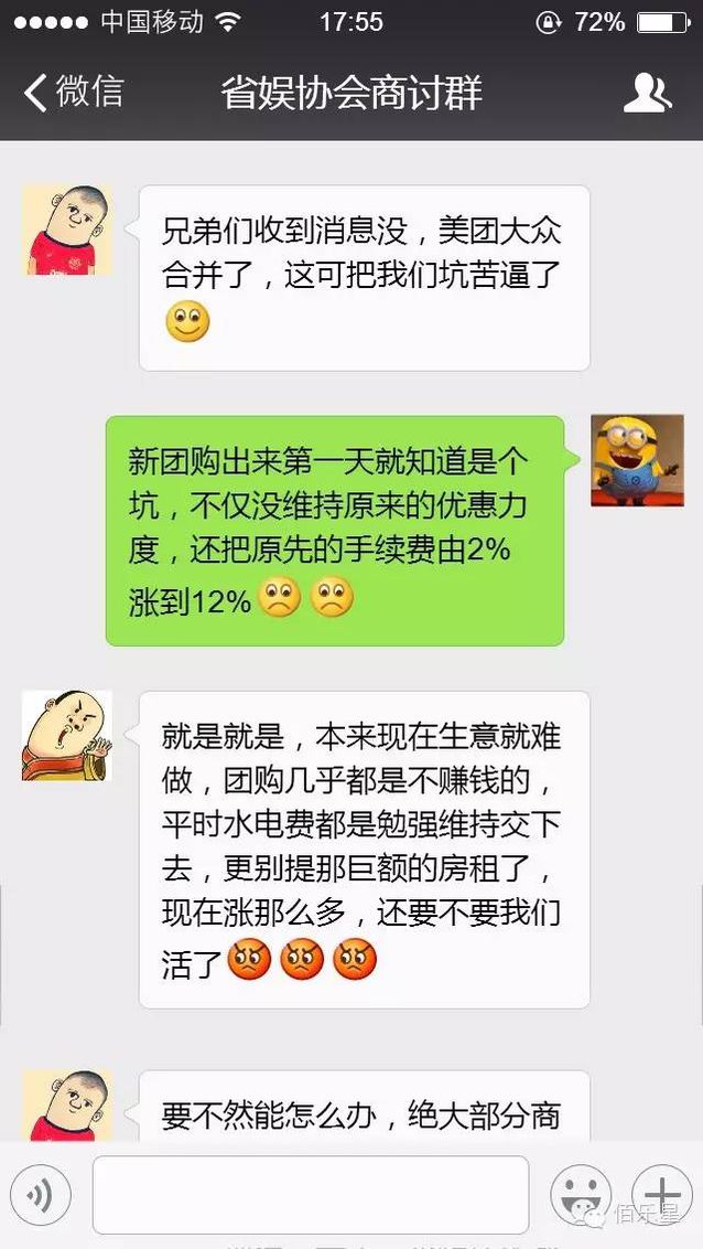 動靜是從一個名為“省娛協(xié)會商討群”的微信聊天截圖爆出來的,當事者為武漢KTV商家表示,新美大合并后,將原來的手續(xù)費由2%漲到12%,商家在討論群里集體表示,在團購的影響下,業(yè)務利潤已經(jīng)很低了,再多收取抽成點,獲得收益甚至不足以支撐基本糊口。