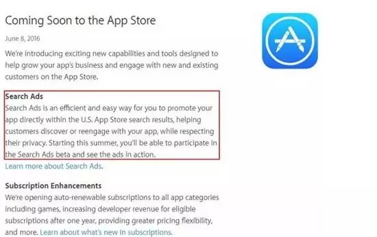 付費推廣 App 展現方式示意圖 另外,每一個搜索結果頁面只會泛起一個付費推廣的 App,蘋果會以類似 Google Adwords 的付費網絡推廣系統來決定哪些應用泛起在用戶的搜索頁面。 2015年,全球蘋果用戶在 App Store 消費的金額超過200億美元,可用的 App 更是多達190萬種,這也導致了應用曝光的難度加大,良多開發者反映,在 App Store 上應用曝光的機會越來越少,也越來越難題,甚至催生了大量的第三方刷榜機構,這不管是對于用戶仍是開發者都并非好事。蘋果表示,這次新增的付費推廣功能將可以匡助更多的 App 取得曝光的機會,也可以讓用戶更利便的獲取到優秀的應用。 蘋果官方公布, App Store 2.0 將會首先在北美進行測試,在今年秋季正式上線。 |