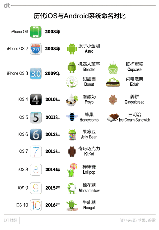 好吧,別告訴我你當真讀完了。 DT君給不喜歡句讀的你來翻譯一下:這不是iOS所以我并不關心安卓取什么名字,以及我不分單詞有關系嗎…… 好的,DT君不是故意要用iOS擁躉來黑安卓黨的,咳咳。因此下面這些信息,足以撫慰安卓黨們受傷的心靈。 移動系統(tǒng)命名PK:安卓呆萌小甜心,蘋果板著臉數(shù)數(shù) DT君臆測,泛博蘋果用戶和使用著“改良”過的安卓系統(tǒng)的中國用戶,對安卓原生系統(tǒng)的命名方法并不認識。 實在從2009年5月開始,安卓系統(tǒng)就開始使用甜點來作為版本代號,這些版本按照大寫字母的順序來進行命名,目前最新版本輪到了N。在此之前,谷歌曾經(jīng)用過原子小金剛(Astro)和機器人班亭(Bender)這種不明覺厲的名字,之后就越來越接地氣——不包括最新的牛軋?zhí)堑脑挘瑥腃開始安卓已經(jīng)使用了11個甜品進行命名。 谷歌為這些版本都制作了雕塑。但是DT君覺得,看著身穿谷歌T恤的程序員,爭先恐后和甜甜圈、三明治們合影,畫面卻有些詭異。 至于為什么選了這么個方法進行命名,谷歌發(fā)言人沒有給出任何清晰的理由:“這就似乎某種內(nèi)部團隊的事情,我們想做的有點——怎么說——有點神秘。” 這樣的命名風格就和這個安卓機器人一樣,顯得活潑但又有點“脆弱”,與蘋果對其移動系統(tǒng)IOS的命名比擬,風格迥異。下面這張圖,足以說明題目: