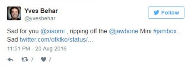 近日,小米副總裁雨果·巴拉在接受國外媒體采訪時透露,小米很快將在美國開售智能手機。然而,手機還沒開始賣,小米藍(lán)牙音箱就被Jawbone以為是抄襲了他們的產(chǎn)品。 Jawbone首席運營官、Fuseproject首席設(shè)計師伊夫斯·貝哈爾在Twitter上直接@小米,稱小米方盒子藍(lán)牙音箱抄襲了自家的Jawbone Mini Jambox音箱的設(shè)計,并且對小米的行為感到悲哀。