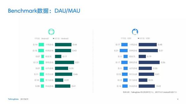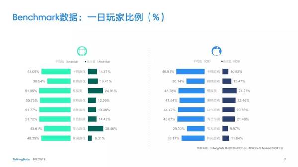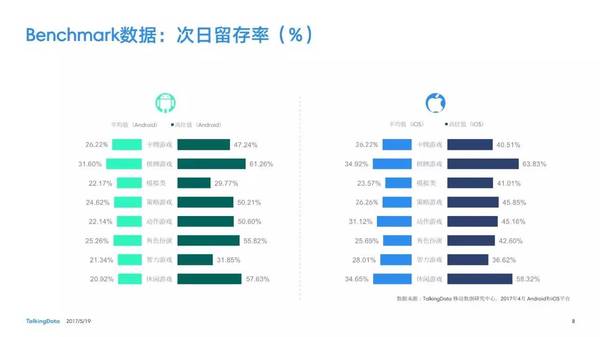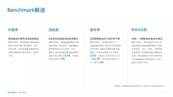 付費率:2017年4月,移動游戲在Android和iOS渠道的付費率保持安穩(wěn),其間,角色扮演、動作和戰(zhàn)略等偏重度類型移動游戲的付費率環(huán)比上月略有降低; 用戶活潑度:2017年4月,Android和iOS渠道移動游戲用戶的活潑度(Dau/Mau)全體保持安穩(wěn)運轉態(tài)勢,其間,iOS渠道角色扮演類移動游戲的周活潑率環(huán)比增加13.5%,月活潑率環(huán)比增加1.2%; 用戶留存率:2017年4月,移動游戲用戶在Android和iOS渠道的用戶留存狀況有升有降;iOS渠道棋牌類移動游戲的一日玩家份額比較上月增加2.2%,而其次日留存率比較上月降低6.7%,7日留存率則比較上月降低11.4%; 運用時長&次數(shù):2017年4月,移動游戲用戶的日均游戲次數(shù)在Android和iOS渠道整體有所增加,其間,休閑、卡牌類移動游戲的日均游戲次數(shù)的增幅相對較高;移動游戲用戶的均勻運用時長在Android渠道保持安穩(wěn),而在iOS渠道略有降低。 |