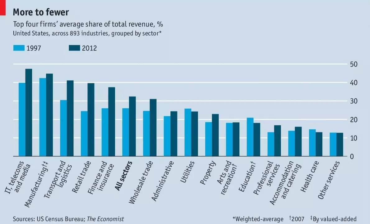 1997年對比2012年,美國各行各業中TOP4公司所占有的市場比例 芝加哥大學斯蒂格勒中心(Stigler Center)主任路易吉·津加萊斯(Luigi Zingales)期望提請大家留意的一點是,google與Facebook能夠取得成功的因素是美國在1998年克林頓總統任內,就微軟(Microsoft Corp.)為限制競賽對手網景(Netscape)而將頁面瀏覽器綁定視窗操作體系的做法,對微軟發申述訟。初審法院做出微軟應被分拆的判決后,經聯邦上訴法院推翻(不過并未推翻獨占判決),最終在小布什政府任內達到寬和。但是訴訟削弱了微軟獨霸互聯網的才能。津加萊斯以為,現在的獨占者即是舊日的草創公司,健康的經濟體系需要給后來者留出空間。 市場高度集中存在多種因素,其間之一無疑是所謂的網絡效應,這也是微軟訴訟中的一大反獨占觀點。網絡效應理論以為,運用一個渠道——例如蘋果手機或Facebook——的人數越多,這一渠道就益發有用且處于主導位置。舉例來說,蘋果手機受歡迎,很大程度上仰賴于蘋果公司(Apple Inc.)旗下使用商鋪中的許多商品,而使用商鋪受歡迎則是因為開發商們愿意為大受歡迎的智能手機編制程序。網絡效應能夠發明沃倫·巴菲特(Warren Buffett)所謂的“競賽護城河”。