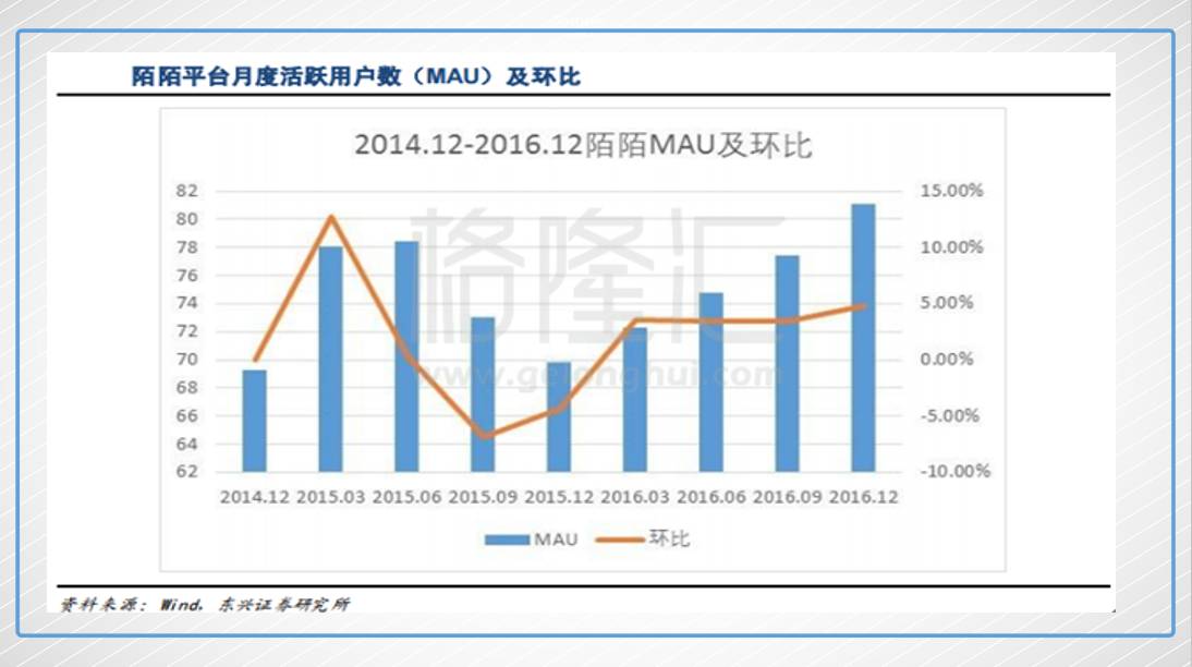 天然,陌陌股價這么的大漲,離不開其牛X的成果增加。2016年是直播大發展的一年,陌陌依托著直播的風口取得了驚人的成果——16年收入同比增加313%,贏利則翻了9.6倍。同時,在直播的股動下,其要害的月活(MAU)也得以康復增加,去年底陌陌渠道月活數為8110萬,實在是打了一個美麗的翻身仗。
