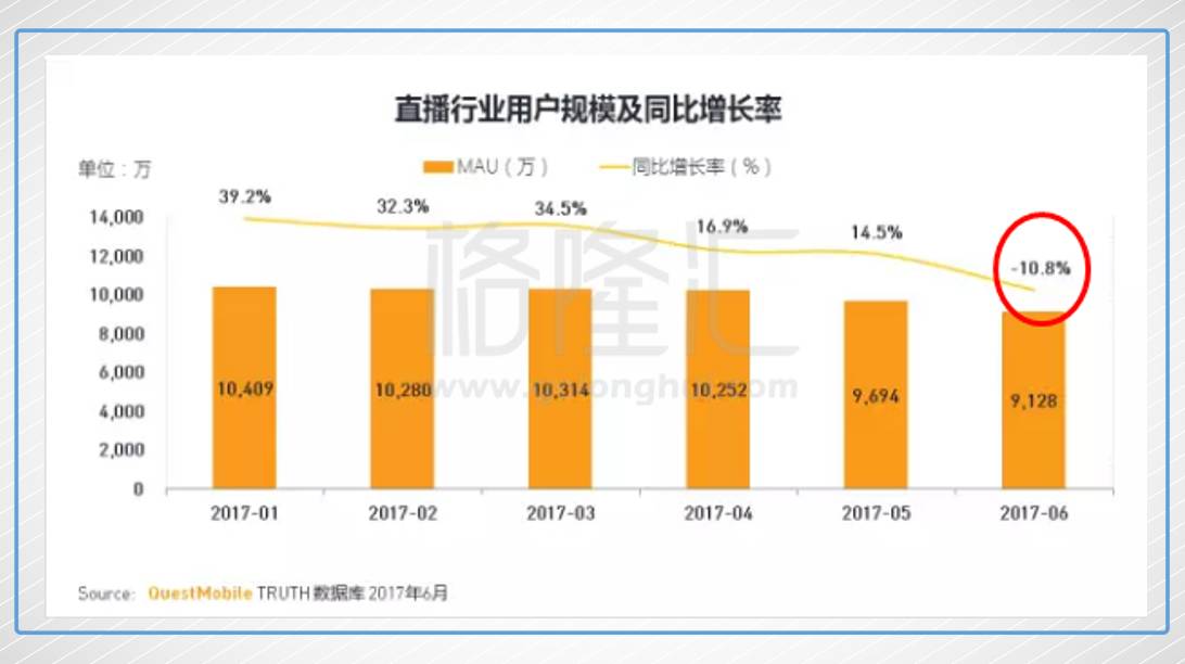 因為方針趨嚴,直播內容遭到很大約束,加之內容同質化嚴重,許多渠道都呈現了用戶丟失的景象。依據QuestMobile最新發布的陳述顯現,直播職業月活潑用戶規劃從2017年1月的10409萬人,降至6月的9128萬人,同比增加為-10.8%。這是直播職業用戶規劃初次呈現負增加。