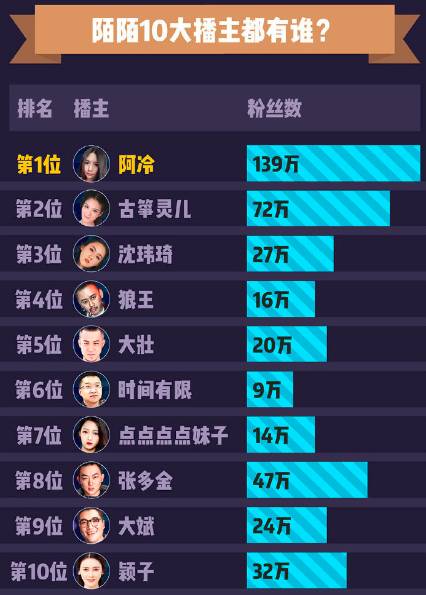 陌陌在2016年選舉了年度10大主播,依據陌陌提供的資料顯現,人氣最高的阿冷粉絲數量在139萬,剩余的主播粉絲量級均未過百萬。