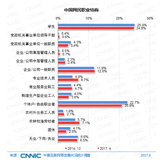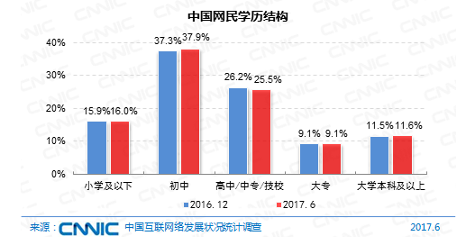 在學歷構成上,我國網民依然以中等學歷集體為主,初中、高中/中專/技校學歷的網民占比別離為37.9%、25.5%。與2016年末比較,網民的學歷結構改變不大。