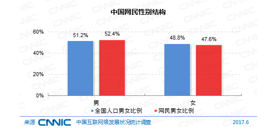 在性別構成上,我國網民男女份額為52.4:47.6,同期全國人口男女份額為51.2:48.8,網民性別結構趨向均衡,且與人口性別份額根本共同。