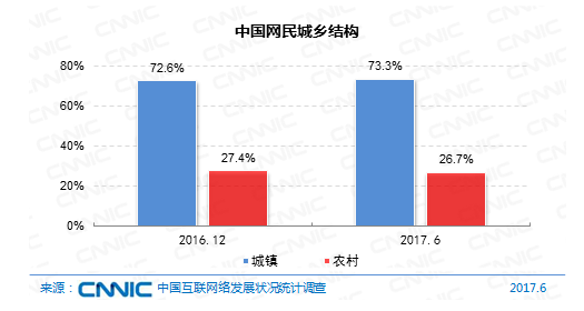 在城鄉結構上,我國網民中農村網民占比26.7%,規劃為2.01億;鄉鎮網民占比73.3%,規劃為5.50億,較2016年末添加1988萬人,半年增幅為3.7%。