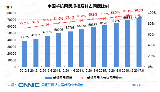 到2017年6月,我國手機網民規劃達7.24億,較2016年末添加2830萬人。網民運用手機上網的份額由2016年末的95.1%提高至96.3%。