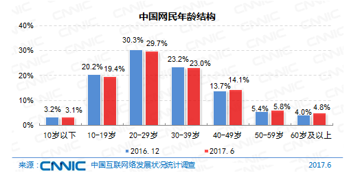 在年紀構成上,我國網民仍以10-39歲集體為主,占全體的72.1%:其間20-29歲年紀段的網民占比最高,達29.7%,10-19歲、30-39歲集體占比別離為19.4%、23.0%。與2016年末比較,40歲及以上中高齡集體占比添加1.7個百分點,互聯網繼續向這個年紀集體浸透。