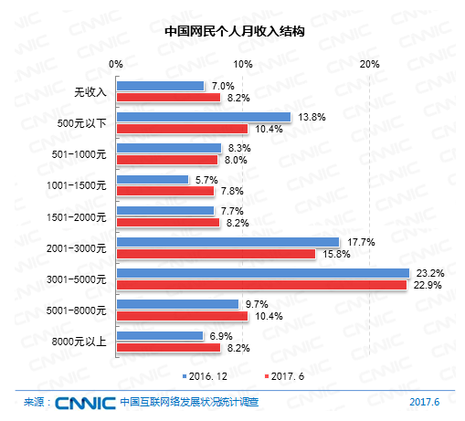 在收入結構上,網民中月收入在2001-3000元及3001-5000元的集體占比較高,別離為15.8%和22.9%。較2016年末,收入在5000元以上的網民人群占比提高了2.1個百分點。