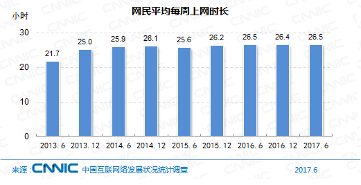 2017年上半年,我國網民的人均周上網時長為26.5小時,與2016年根本相等。