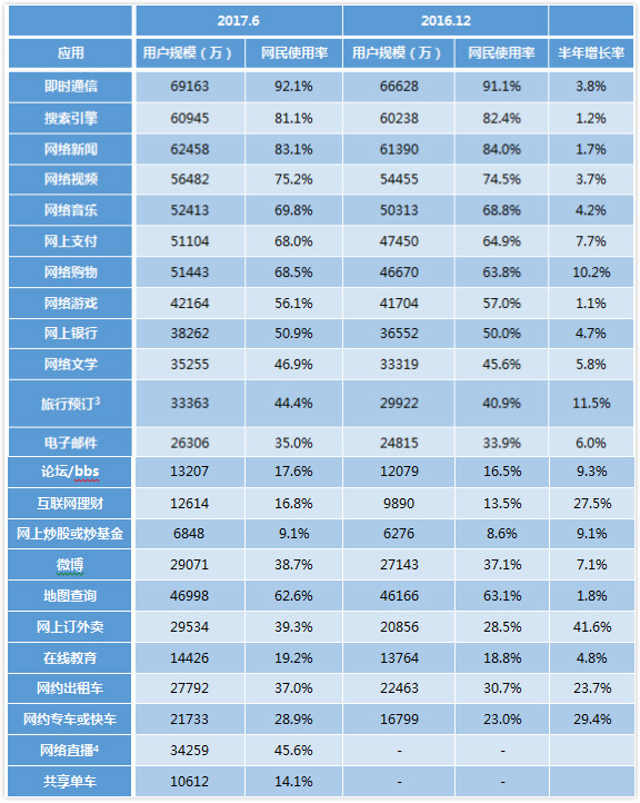2017年上半年,我國個人互聯網運用堅持快速開展,其間網上外賣和互聯網理財是添加最快的兩個運用,半年添加率別離為41.6%和27.5%,網絡購物仍堅持較快添加,半年添加率為10.2%;手機運用方面,手機外賣、手機在線教育課程用戶規劃添加最為顯著,半年添加率別離為41.4%和22.4%。