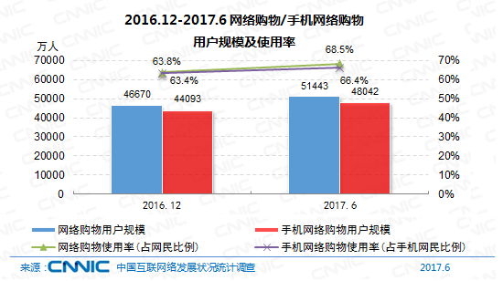 到2017年6月,我國網絡購物用戶規劃到達5.14億,相較2016年末添加10.2%,其間,手機網絡購物用戶規劃到達4.80億,半年添加率為9.0%,運用份額由63.4%增至66.4%。