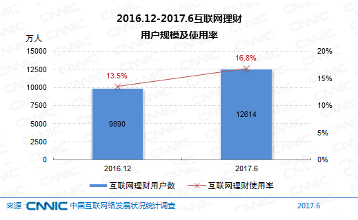 到2017年6月,我國購買互聯網理財產品的網民規劃到達1.26億,較2016年末添加用戶2724萬人,網民運用率從13.5%升至16.8%。