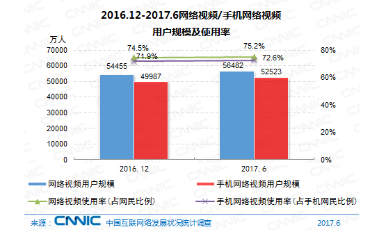 到2017年6月,我國網絡視頻用戶規劃達5.65億,較2016年末添加2026萬人,添加率為3.7%;網絡視頻用戶運用率為75.2%,較2016年末提高0.7個百分點。其間,手機視頻用戶規劃為5.25億,與2016年末比較添加2536萬人,添加率為5.1%;手機網絡視頻運用率為72.6%,比較2016年末添加0.7個百分點。