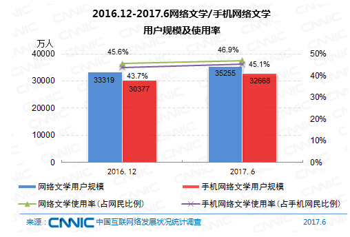 到2017年6月,網絡文學用戶規劃到達3.53億,較去年末添加1936萬,占網民全體的46.9%,其間手機網絡文學用戶規劃為3.27億,較去年末添加2291萬,占手機網民的45.1%。