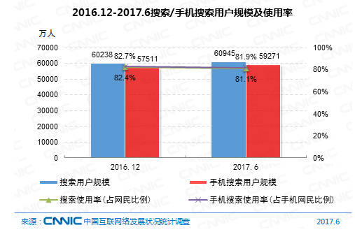 到2017年6月,我國搜索引擎用戶規劃達6.09億,運用率為81.1%,用戶規劃較2016年末添加707萬,添加率為1.2 %;手機搜索用戶數達5.93億,運用率為81.9%,用戶規劃較2016年末添加1760萬,添加率為3.1%。