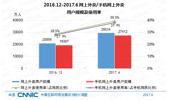 到2017年6月,我國網上外賣用戶規劃到達2.95億,較2016年末添加8678萬,添加率到達41.6%。其間,我國手機網上外賣用戶規劃到達2.74億,添加率為41.4%,運用份額到達37.9%,提高10個百分點。
