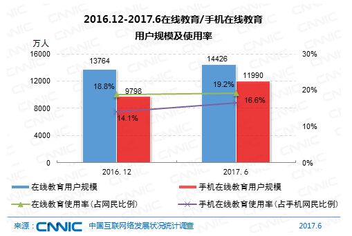 到2017年6月,我國在線教育用戶規劃達1.44億,較2016年末添加662萬人,半年添加率為4.8%;在線教育用戶運用率為19.2%,較2016年末添加0.4個百分點。其間,手機在線教育用戶規劃為1.20億,與2016年末比較添加2192萬人,添加率為22.4%;手機在線教育用戶運用率為16.6%,比較2016年末添加2.5個百分點。