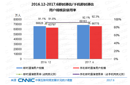到2017年6月,即時通訊用戶規劃到達6.92億,較2016年末添加2535萬,占網民全體的92.1%。其間手機即時通訊用戶6.68億,較2016年末添加2981萬,占手機網民的92.3%。