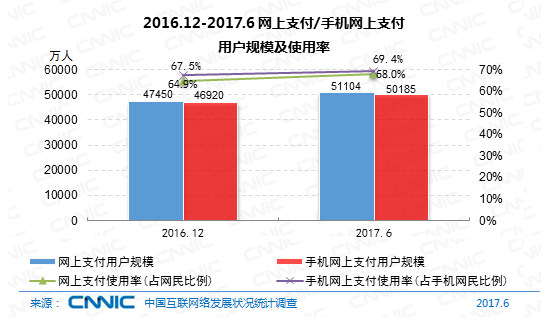 到2017年6月,我國運用網上付出的用戶規劃到達5.11億,較2016年12月,網上付出用戶添加3654萬人,半年添加率為7.7%,我國網民運用網上付出的份額從64.9%提高至68.0%。其間,手機付出用戶規劃添加迅速,到達5.02億,半年添加率為7.0%,網民手機網上付出的運用份額由67.5%提高至69.4%。