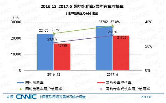 到2017年6月,我國網約出租車用戶規劃到達2.78億,較2016年末添加5329萬,添加率為23.7%。網約專車或快車用戶規劃到達2.17億,添加率為29.4%,用戶運用份額由23%提高至28.9%。