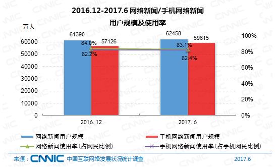 到2017年6月,我國網絡新聞用戶規劃為6.25億,半年添加率為1.7%,網民運用份額為83.1%。其間,手機網絡新聞用戶規劃到達5.96億,占手機網民的82.4%,半年添加率為4.4%。