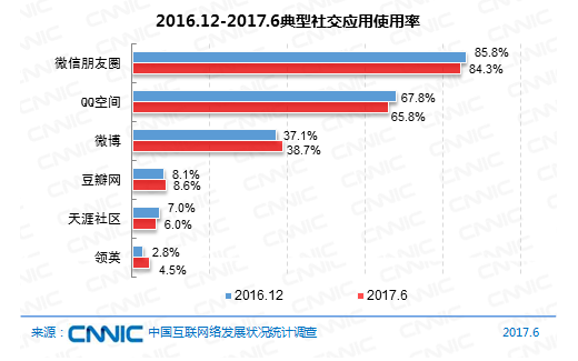 到2017年6月,運用率排名前三的交際運用均歸于綜合類交際運用。微信朋友圈、QQ空間用戶運用率別離為84.3%和65.8%;微博用戶運用率繼續回升,達38.7%,較2016年12月上升1.6個百分點。筆直類交際運用中,豆瓣用戶運用率為8.6%。