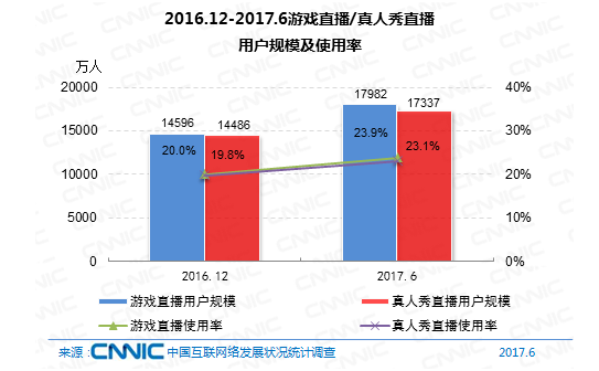 別的值得注意的是,到2017年6月,網絡直播用戶共3.43億,占網民全體的45.6%;而到2016年12月,網絡直播用戶規劃到達3.44億,占網民全體的47.1%。與半年前比較,網絡直播的用戶規劃和在網民中的全體占比皆呈現下降。