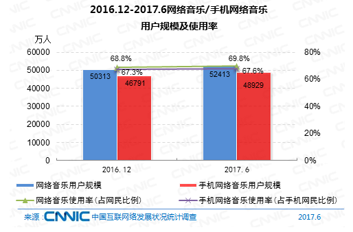 到2017年6月,網絡音樂用戶規劃到達5.24億,較去年末添加2101萬,占網民全體的69.8%。其間手機網絡音樂用戶規劃到達4.89億,較去年末添加2138萬,占手機網民的67.6%。