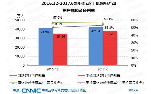 到2017年6月,我國網絡游戲用戶規劃到達4.22億,較去年末添加460萬,占全體網民的56.1%。手機網絡游戲用戶規劃為3.85億,較去年末添加3380萬,占手機網民的53.3%。