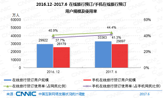 到2017年6月,在網上預定過機票、酒店、火車票或游覽休假產品的網民規劃到達3.34億,較2016年末添加3441萬人,添加率為11.5%。在網上預定火車票、機票、酒店和游覽休假產品的網民別離占比37.6%,19.1%,20.5%和9.3%。其間,手機預定機票、酒店、火車票或游覽休假產品的網民規劃到達2.99億,較2016年末添加3717萬人,添加率為14.2%。我國網民運用手機在線游覽預定的份額由37.7%提高至41.3%。其間,手機預定酒店的運用率提高幅度最大。