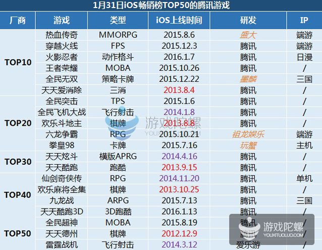 (僅統計2016年1月31日App Store當天暢銷榜,騰訊發行游戲排名) 實在我們結合這幾年的騰訊手游發行情況,騰訊的主要策略仍是獲取用戶為主,由于在之前幾年中渠道擁有很大的上風。騰訊70%的產品都是基于大品類籠蓋,包括跑酷、飛行射擊。但跟著人口紅利上風衰減,用戶不斷成熟,渠道已經不能決定用戶選擇游戲的方向,游戲本身的質量已經越來越重要,越來越多的用戶開始有了明確需求。細分市場,垂直用戶以及精品產品成為了騰訊的基本打法,這一策略也被市場所驗證。不外手游生命周期的題目,依舊困擾著所有從業者,如何延長?最靠譜的方式仍是MMO,這個被端游、頁游市場驗證過的形式。不光騰訊,2016年所有的大廠都往這個方向靠攏。 2015年騰訊發行的重點產品已經集中在了重度類型,當然騰訊內部的分類沒有輕、中、重,而是按類型分,以這個尺度看:卡牌、休閑、MOBA、FPS四類為主。IP類產品在騰訊2015的手游中表現十分凸起。但顯然騰訊還有大量的IP產品和來自合作CP的產品。