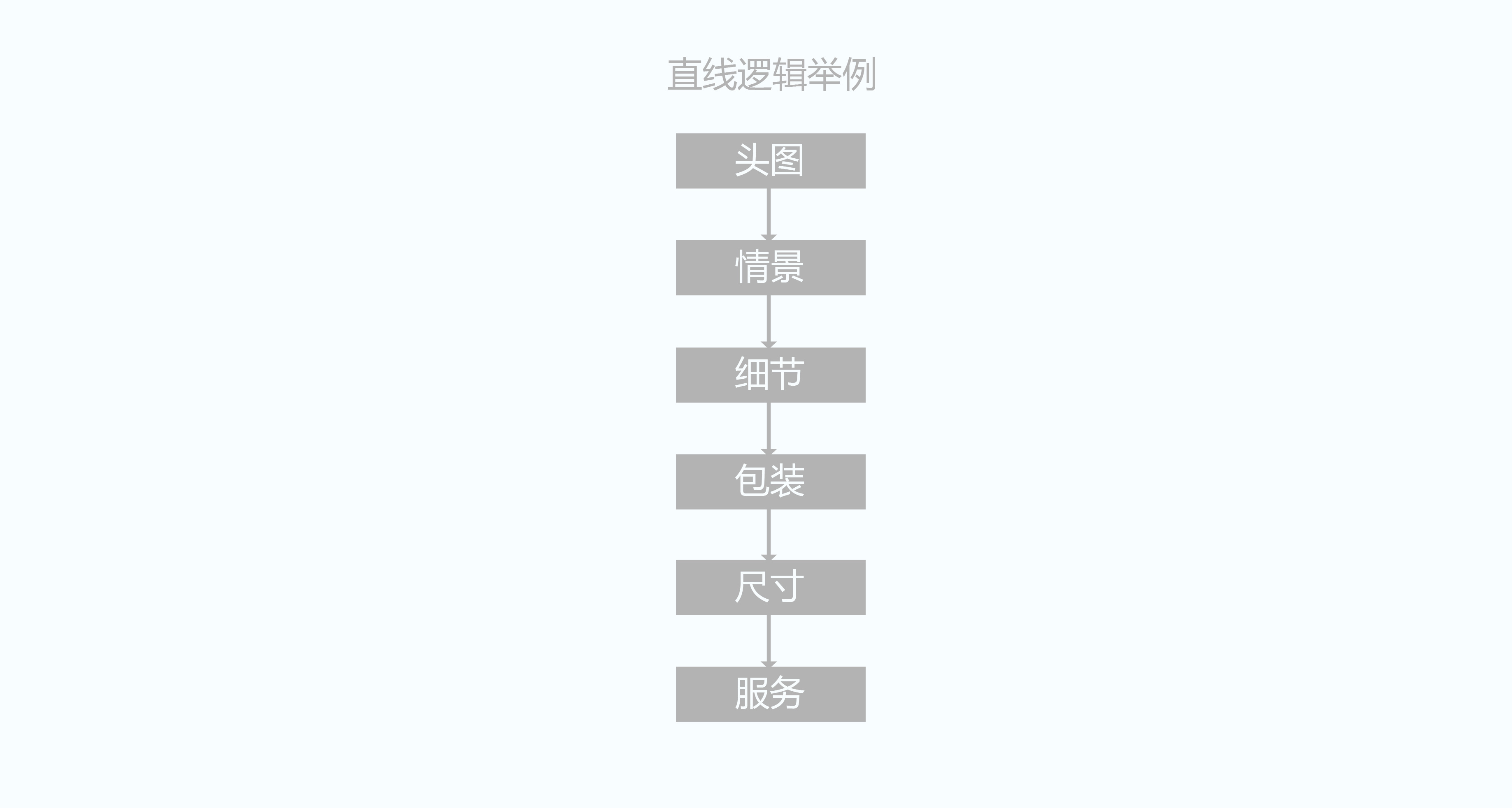 根據古騰堡圖表的閱讀邏輯來看,這一系列圖片首先從左上角看到的是該品牌的logo,再由閱讀軌跡從對角線視覺中的詞組到右下角的產品,畫面需要夸大的元素都在閱讀邏輯的規律下展現。其余的視覺盲點則是輔助性元素。 2.直線式邏輯 對于直線式邏輯,我的理解是自上而下猶如權力分配等級軌制。同工業鏈一樣,一環扣一環,每個環節都是緊密相連前后有序,嚴謹公道。例如一個產品的頁面詳情如下: