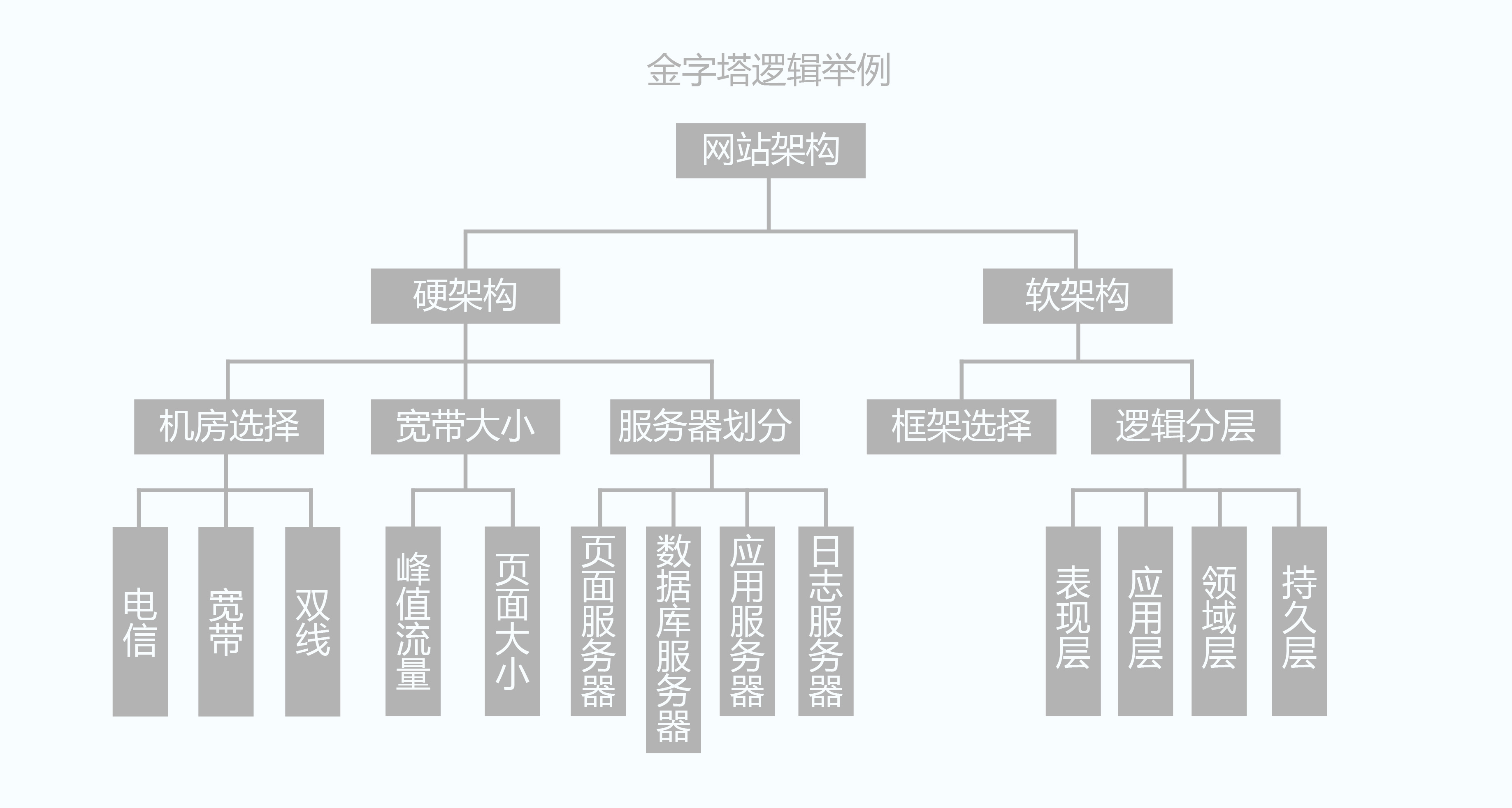 直線式邏輯思路明確,針對性強,輕易看懂,我們引導用戶順著這個邏輯看設計也不會思路攪渾。 3.金字塔式邏輯 金字塔式邏輯,結構中的各種分類以僅有的幾種邏輯方式互相聯系(向上、向下和橫向),構成相互聯系緊密且通暢的邏輯思路。金字塔邏輯運用廣泛,例如網站架構