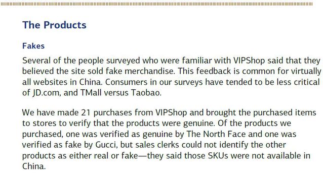 對于閃購模式的唯品會而言,品牌在劃定的時間內上新,通過折扣的方式,來刺激消費者快速決議計劃購買。在唯品會的首頁上,每個品牌上新的位置都很有限,也都意味著巨大的利益牽扯。一位曾上過唯品會的商家透露,唯品會在招商控制上層層審批,但想上唯品會(特別是首頁)的品牌商趨之若鶩。即便治理上很嚴格,但仍是避免不了一些“潛規(guī)則”。 事實上,聯(lián)系關系交易本身并不違法,根據SEC的要求,與上市公司產生聯(lián)系關系交易的行為必需要對外表露。這也是考慮到,聯(lián)系關系交易方可以運用行政氣力撮合交易的進行,從而有可能使交易的價格、方式等在非競爭的前提下泛起不公正情況,形成對股東或部門股東權益的侵犯,也易導致債權人利益受到損害。 售賣未經品牌商授權的商品 贗品對于電商來說,是一個“惡疾”。JCAP講演中夸大,調查了多位消費者,均表示在唯品會上買到過贗品。 JCAP調查職員抽選了21個調查樣本,去品牌商的線下實體店驗貨,其中樣本中的Gucci被證明為贗品,其余的商品樣本,銷售職員也無法辨明真?zhèn)巍?ldquo;這些商品的型號并沒有在中國銷售。”