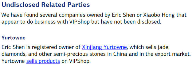 J CAP稱,董事長兼CEO沈亞、副董事長兼COO洪曉波至少持有三家公司與唯品會產生聯(lián)系關系交易。J CAP指出,沈亞控制的國玉這家公司(http://www.yurtowne.com)在唯品會上售賣產品。