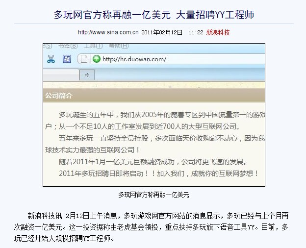 圖3:智聯招聘招股書中寫到,2013年2月28日,智聯向Seek發售3,061,591股普通股,價值僅32.9141萬美元;2013年10月31日,智聯又向Seek增發6,488,409股普通股,價值為528.4834萬美元。兩次合計注資約561萬美元。 第三名、 歡聚時代強調2300萬報道投資額:1億美元 真實投資額:7700萬美元 2011年2月,多玩網曾公布獲得1億美元融資,這一投資由老虎基金領投。 以下為媒體報道截圖: