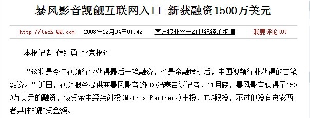 圖5:在招股書financingactivities一欄可以看出,截止到2011年12月31日,YY所有融資金額主要來自老虎基金的7770萬美元。 由圖4也可看出,YY并不止一次虛報融資額。在2009年,YY稱獲2300萬融資,但招股書顯示2009年12月獲C-1輪融資143.9萬美元,C-2輪融資1050萬美元,共計1193.9萬美元,僅為報道融資額2300萬美元的一半。 四、 狂風科技融資金額600萬變1500萬報道融資額:1500萬美金 真實融資額:600萬美金 創造了40多個漲停紀錄的狂風科技,在近期股市持續震蕩大跌之前卻“神奇”停牌,目前股價還保持高位。狂風曾多次謀求登陸美股未果,無奈拆VIE后回歸海內,卻成就了“妖股”,但這時代的幸運兒,也有“黑歷史”。 2008年12月,狂風影音CEO馮鑫公布前一個月獲得1500萬美元融資,由經緯創投主投、IDG跟投,當時的媒體報道截圖如下: