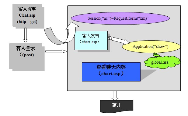 ![]() 聊天室處理流程 Global.asa文件的格局 global.asa文件實在是一個可選文件,它是專門存放全局變量和局部變量的文件,即在這里聲明具有會話和應用程序作用域的變量,同時還可以指定事件程序,客戶端是看不到該文件的,它存放在應用程序的根目錄下,文件名必需是global.asa,每人應用程序只能有一個global.asa文件,文本中不能有HTML標記,不答應更改文件名。格局如下: <script  language=”VBScript ” runat=”Server”>   Sub session_OnStart        當客戶首次運行ASP應用程序中的任一頁面時運行。       ……..   End sub Sub session_OnEnd        當某客戶會話超時或退出應用程序時運行。      ……..   End sub   Sub Application_Onstart    當任何客戶首次訪問該應用程序的首頁面時運行。        ……..   End sub Sub Application_OnEnd    當該站點的WEB服務器封閉時運行。   ……..   End sub </script>  |