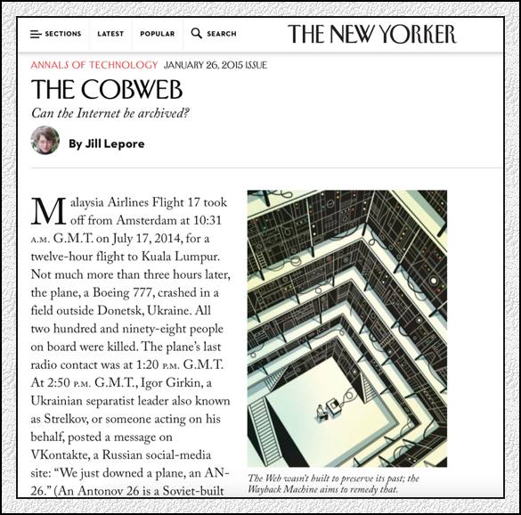而互聯網檔案通常不僅僅是你我的,互聯網是人類的集體記憶,他們不應該被遺忘。 一位棲身在法國的美國先鋒藝術家的色情作品是不是被消失,坦率地說,根本不必大驚小怪;在《花花公子》雜志自覺自愿地讓其封面少女穿上衣服而不是脫光衣服以吸引讀者的時代,拿風化說事太無聊了。杰羅姆放不下這個話題,一定要說上幾句的原因是,這位藝術家面臨的題目,既不是版權,也不是風化,而是一個人的故事與這個故事存在的權力。每一個人的故事與作品,構成了這個世界與這個時代,只有通過記憶每一個人的故事與每一個人的作品,歷史才有可能呈現自己完整的結構與色彩。谷歌或者其他隨便任何人,在沒有拿得出手的理由的情況下,怎么可以抹去這個人以及他的故事? 當然,這樣戲劇性的情節,仍舊不是題目的樞紐。更讓人驚奇的是,關于互聯網的集體記憶,也在淡出,谷歌在有意無意地拋卻“記憶”,記憶是有本錢的,那些并不能產出利潤的過去,值得以贏利為目的的企業去動用龐大的資源,存檔嗎? 當然,網絡記憶不是谷歌的題目,這是網絡時代的題目。《紐約客》雜志去年有一篇十分出色的文章《蛛網:互聯網可以被存檔嗎?》