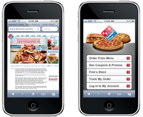 假如你但愿自己的網(wǎng)站能夠輕松的在移動端設(shè)備上訪問,那么應(yīng)當(dāng)消除所有移動端上可能存在的可用性的題目,下面有12條晉升移動端網(wǎng)頁設(shè)計的建議,確保你的頁面能夠通過 可用性測試,并提供良好的用戶體驗。 1、針對移動端進(jìn)行全面優(yōu)化 桌面端網(wǎng)頁在移動端設(shè)備上首要的障礙就是導(dǎo)航的使用。看看下面Domino批薩的案例,它的桌面端和移動端網(wǎng)頁的對比就相稱顯著,移動端頁面經(jīng)由優(yōu)化之后的體驗就完全不同。簡樸說來,優(yōu)化后的移動端頁面更加干凈,有著更輕易導(dǎo)航的CTA按鈕